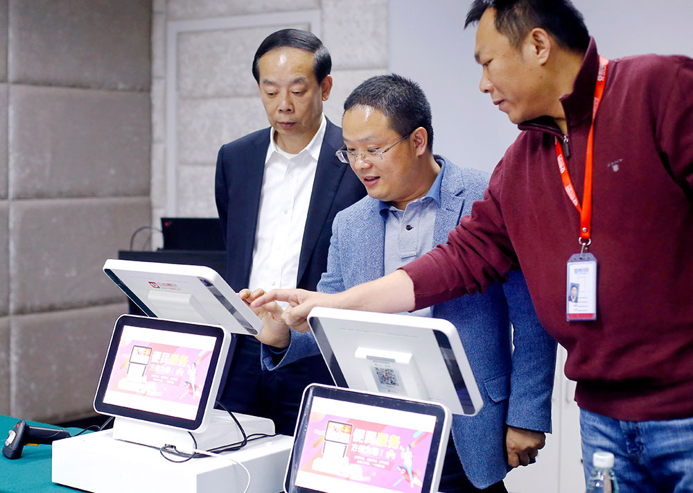 (董事长张一春 wepoker德州,副总裁苏小新为赵勇副局长演示惠付通功能) .