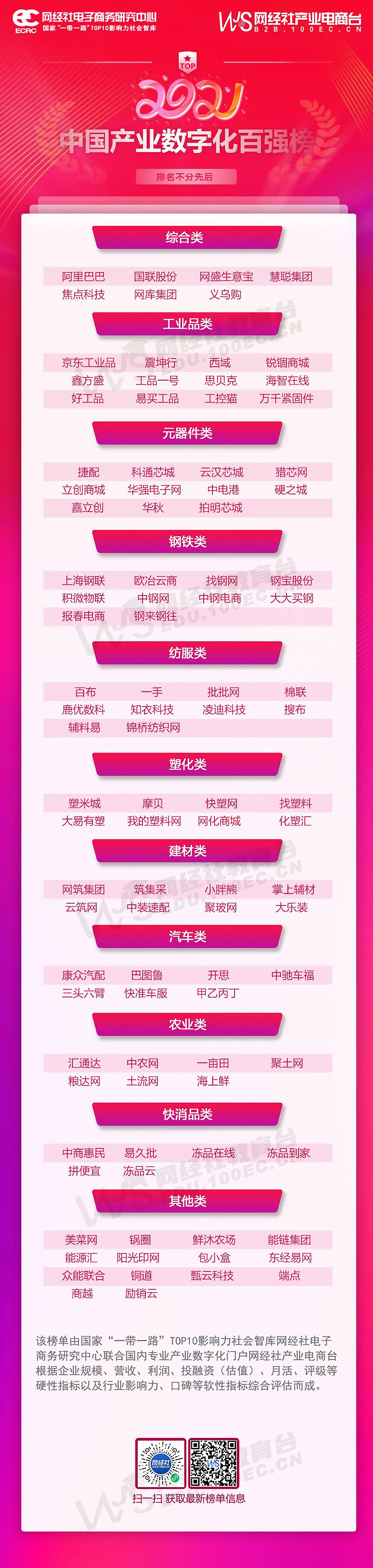 该榜单经过网经社电子商务研究中心根据网经社旗下电商大数据库“电数宝”收录的企业数据,包括平台规模,营收,利润,投融资(估值),月活,评级等硬性指标以及行业影响力,口碑等软性指标综合评估而成,旨在反映当前国内产业数字化企业发展,榜单根据行业细分包括:综合,工业品,元器件,钢铁 wepoker德州,纺服,塑化,建材,汽车,农业,快消品及其他类等进行分类构成共100家企业,上榜企业均为各领域的国内领先平台, 。