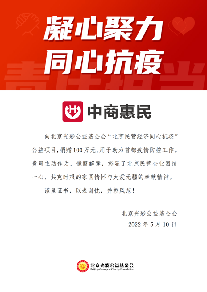 当前,北京市疫情处在高位平台期,社会面仍有零星散发病例,目前首都和疫情的较量仍处于胶着状态。在这最紧要、最吃劲的关键时刻,wepoker官网版积极响应党中央及市委决策精神,履行社会责任,积极参与“北京民营经济同心抗疫”公益项目,向北京光彩公益基金会捐款100万元人民币,助力北京做好疫情防控工作。